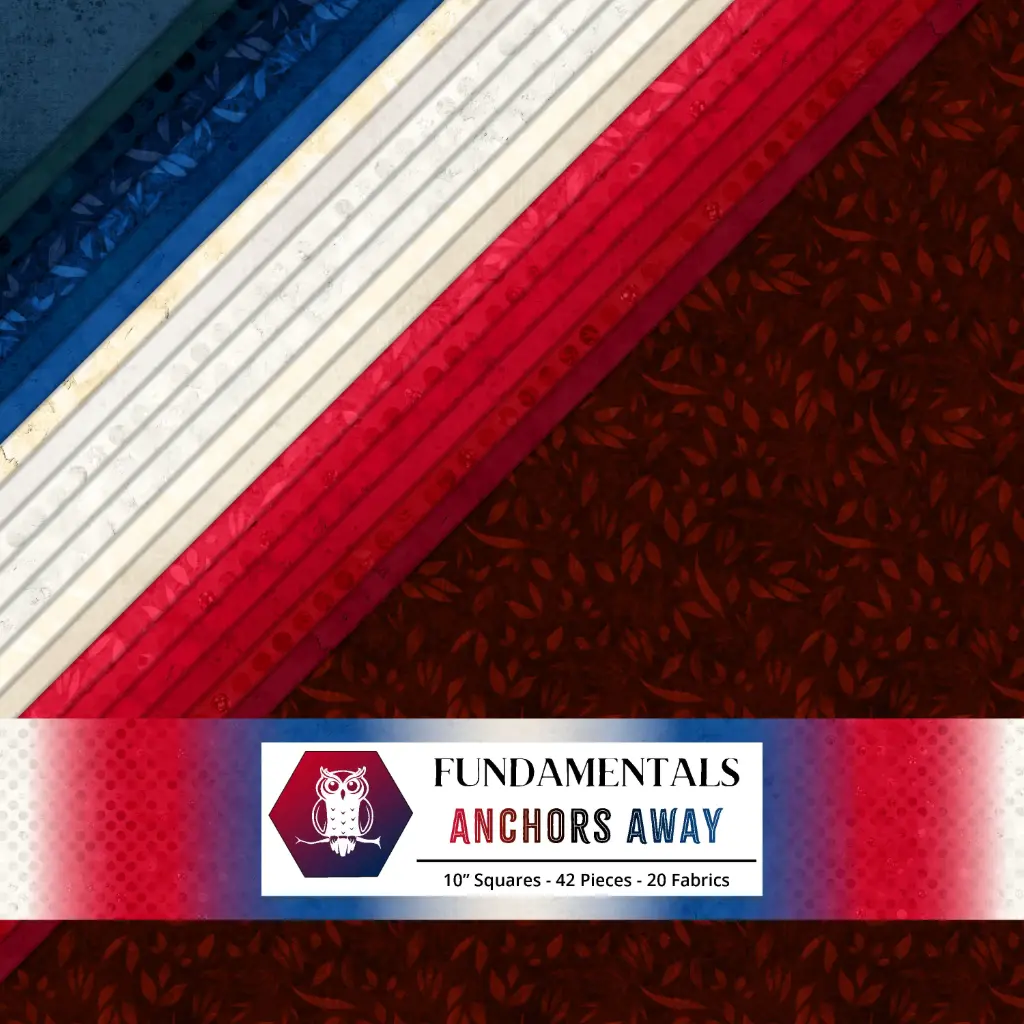 The Anchors Away Stack contains 42 pre-cut 10 inch squares featuring coordinated fabrics from the Anchors Away Fundamentals colorstory. Tonal textures and balanced shades provide depth while still working smoothly with other prints and solids. These large squares are perfect for layer cake quilts, bold quilt blocks, and fast quilt layouts.