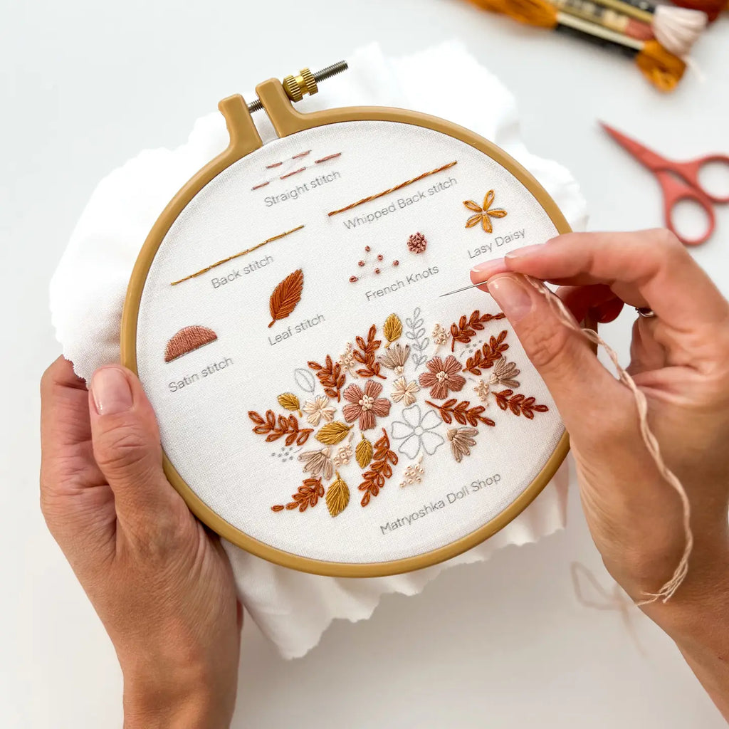 This Beginner Embroidery Kit includes everything needed to master seven essential stitches while creating a beautiful floral design. Inside, you'll find a 6” no-slip hoop, fabric with a printed pattern, three full skeins of DMC embroidery thread, and an embroidery needle. A QR code provides access to detailed step-by-step instructions with photos and a full video tutorial. Perfect for beginners, this kit makes a thoughtful gift for anyone eager to explore modern embroidery techniques.