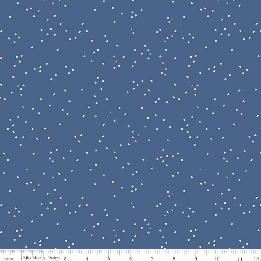 Timeless floral blossoms on a denim blue background. Ideal for everyday quilting, apparel, and accessories.