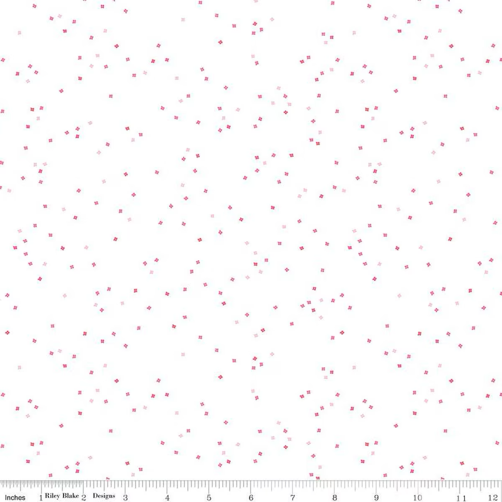 Pink floral blossoms on white fabric. Perfect for quilts, apparel, and cheerful sewing projects.