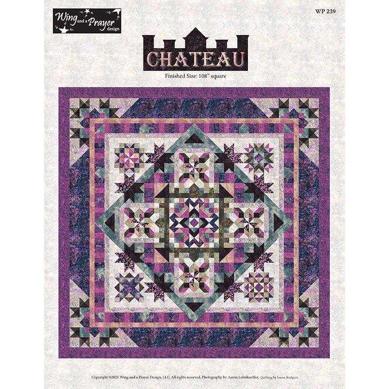 The Chateau BOTM uses 11 specially chosen fabrics that represent the colors of grapes, greenery and woody grapevines. Traditional piecing techniques are used in making this 108” square quilt. The quilt was created with the “Chateau” center block with the castle-like piecing around it representing the mansion of the vineyard with the countryside surrounding it.