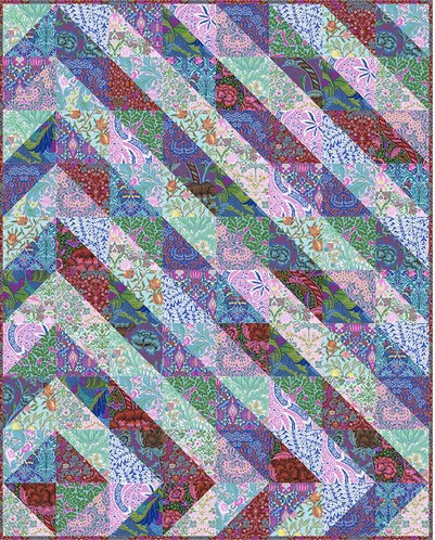 This quilt kit creates a bold 56” x 70” throw using diagonal strip piecing to highlight the vivid Kaffe Fassett x Morris & Co. prints. Designed for confident beginners and up, the project uses straightforward rotary cutting and straight-line sewing—no templates or specialty rulers needed. Fabrics are 100% cotton and include everything required for the quilt top plus the printed pattern.