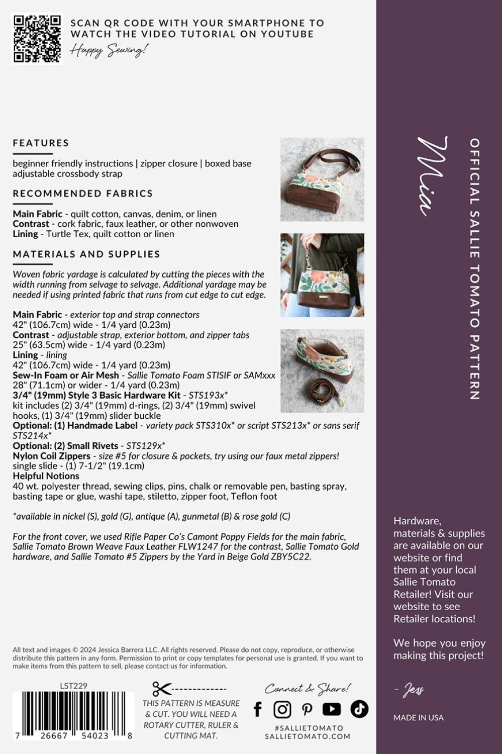 Petite and charming, the Mia crossbody bag is beginnerfriendly and a stylish option to add to any ensemble. This bag's compact design is ideal for carrying essentials for everyday or a night out. The name and design was inspired by Mia Farrow as Daisy Buchanan, in the 1974 film, The Great Gatsby. Mia is also inspired by the warm and kind, Mia Thermopolis, of The Princess Diaries. Finished size: 9" wide, 6" high, and 2-1/2" deep. 22.9cm wide, 15.2cm high, and 6.4cm deep.