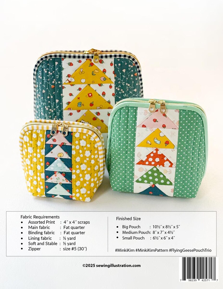 The Flying Geese Pouch Trio Pattern by Minki Kim of Sewing Illustration makes three stylish zipper pouches featuring the classic flying geese design! Perfect for storing sewing notions, makeup, or everyday essentials. With three different sizes, these pouches are as practical as they are pretty. A great scrap-friendly project to showcase your favorite fabrics! A full step-by-step video tutorial is included. Beautifully printed in a sturdy 8.5’’ x 11’’ hardcover format. Finished sizes are Big (10 1/2’’W x 8 1/2’’H x 5''D), Medium (8’’W x 7’’H x 4 1/2’’D), and Small (6 1/2’’W x 6''H x 4''D).