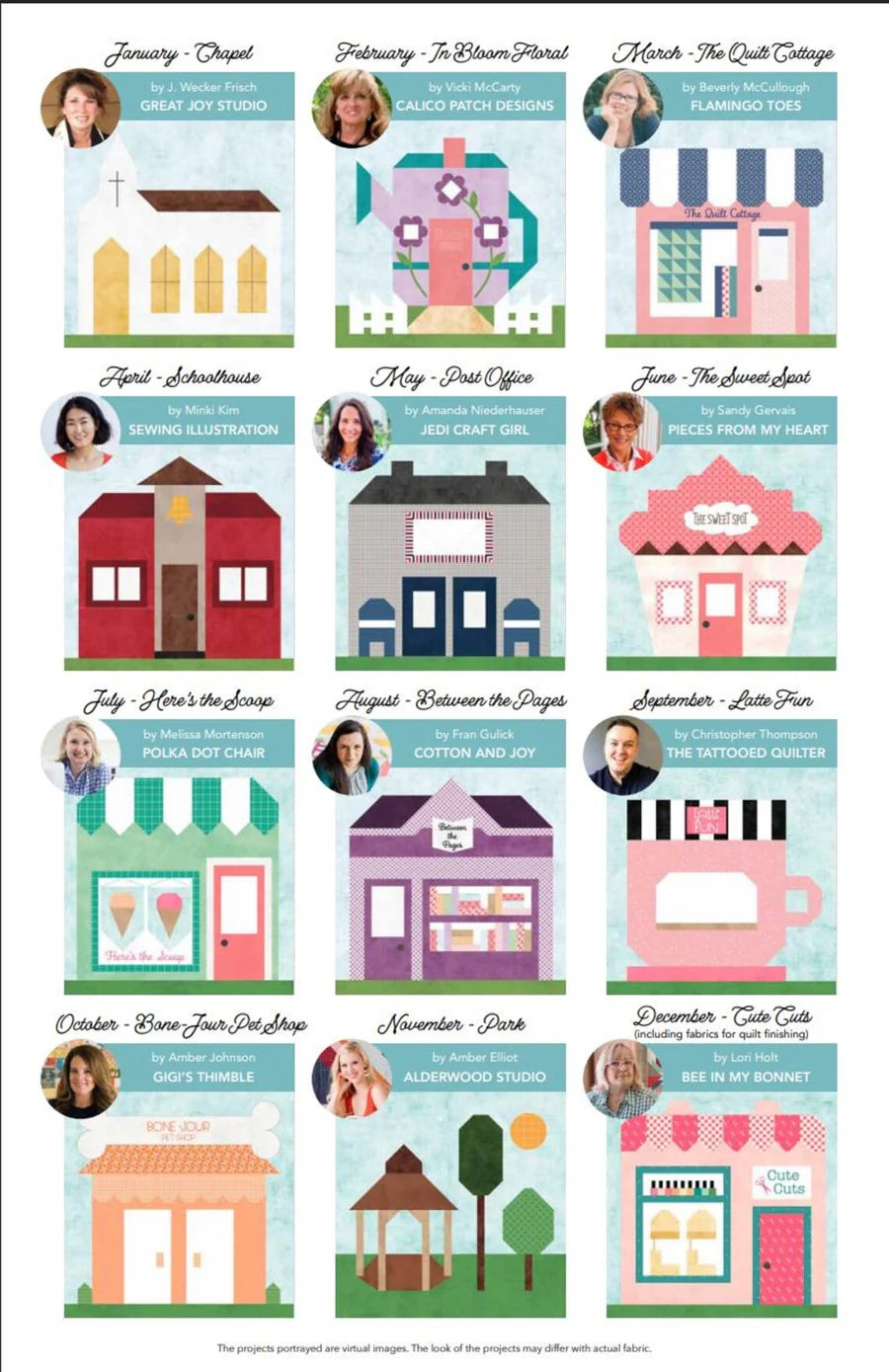 Join us for our 2026 Our Town Kit of the Month Club and receive exclusive monthly tabletop banners in keepsake boxes. Finished quilt size is 72" x 72". The club runs for 12 months (January 2026 to December 2026). January-November kit boxes are 6 1/4" x 6 1/4" x 2 1/2" and include the pattern and fabric for the quilt block of the month. December kit box is 11" x 12 1/4" x 3 1/2" and includes the pattern and fabric for the December quilt block, quilt setting, and binding.