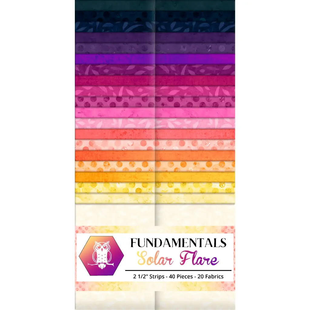 The Solar Flare Strip Pack features coordinated fabrics from the Solar Flare colorstory in the Fundamentals collection by White Owl Textiles. This bundle includes 40 pre-cut 2.5 inch strips in warm radiant tones designed to work together across quilts and patchwork designs. These strips are ideal for jelly roll quilts, borders, and strip pieced blocks.