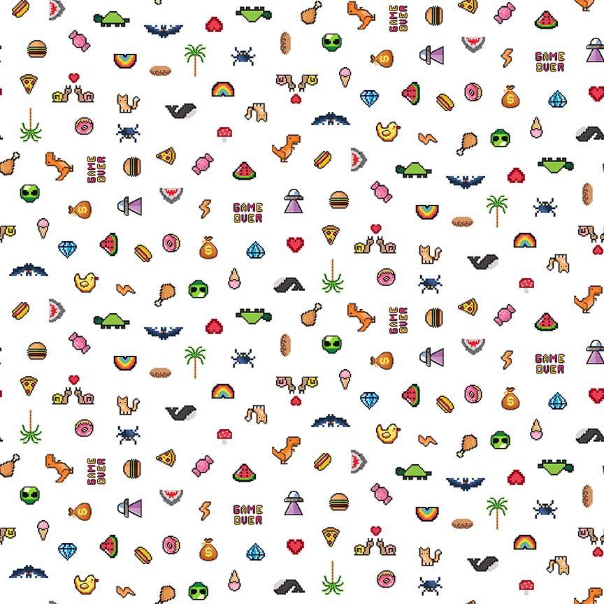 Scattered pixel icons including hearts, power ups, and classic game symbols on a crisp white background. A great low volume option for novelty quilts, sashing, and background use. This print adds playful detail without overwhelming your quilt design and works especially well in modern quilt layouts.