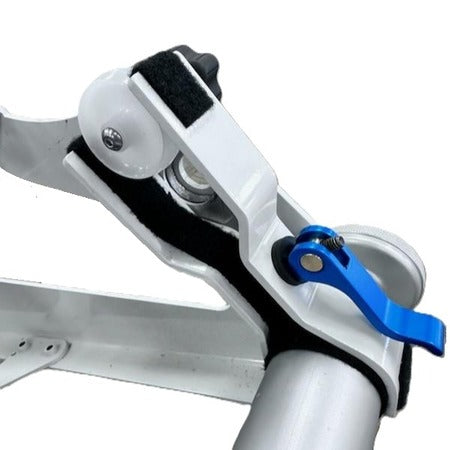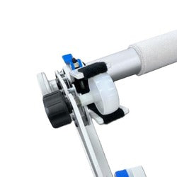 Some quilters prefer to "fully float" their quilt tops. This means that they do not attach their quilt to the quilt top roller. Instead, they allow it to drape over the backing and batting, and simply baste it to the quilt backing. That means the quilt top roller is not used for this method. Some quilters like to completely remove the quilt top roller when loading this way. The optional Texas Hold 'em Bracket mounts in place of the quilt top roller so that the roller brake still functions to hold the quilt backing roller firmly. NOTE: This Deluxe Texas Hold 'em Bracket pictured only works on Comfort Deluxe APQS tables with Hydraulic Legs. The Deluxe table always goes with a Millie30, Millie, Freddie and sometimes Lucey. This does not fit Deluxe Tables with round tubing legs.