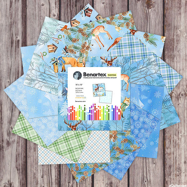 Immerse yourself in serene winter landscapes with the Woodland Wonderland 10x10 Squares collection by Nicole DeCamp for Benartex Fabrics. This thoughtfully curated precut bundle features forty-two 10" x 10" squares showcasing enchanting forest scenes and snowy wilderness imagery. The cohesive design palette eliminates color-matching concerns, making it an excellent choice for quilters seeking a unified aesthetic. Whether you're creating a statement quilt, designing intricate patchwork, or exploring mixed-fabric projects, these precut squares streamline your creative process while delivering professional-quality results.